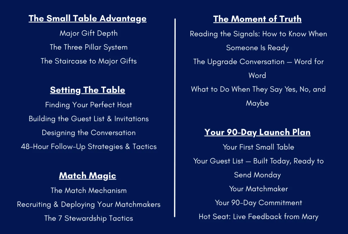 The Small Table Intensive is the live working session where you plan your first intimate donor dinner, build your $1,000 match circle, and map your complete 90-day relaunch — using the proven three-step system from Mary's new book Small Table Big Philanthropy.